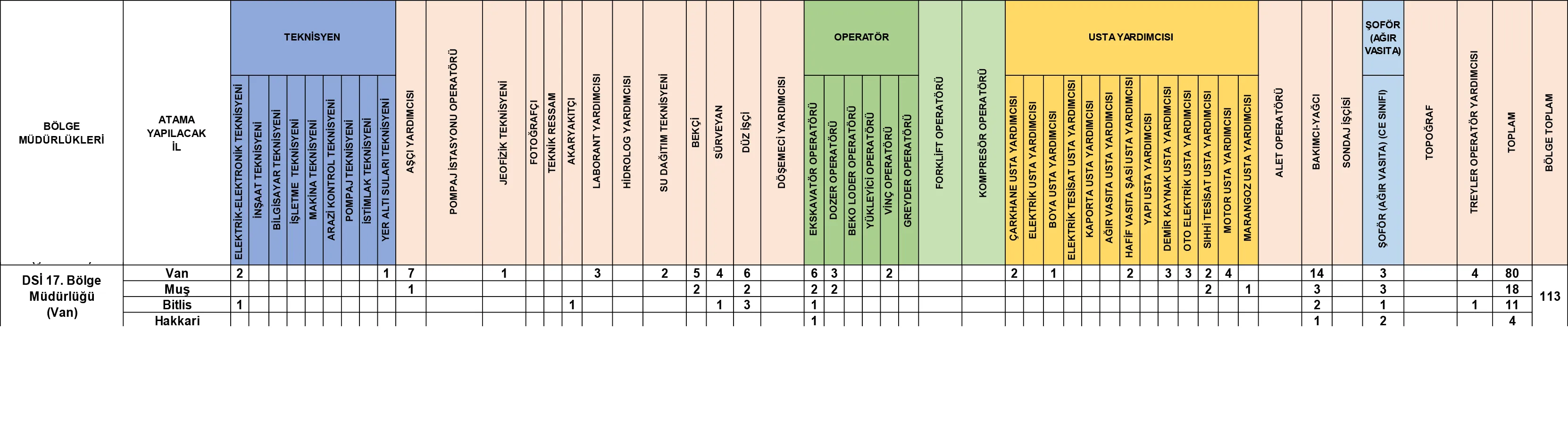Tarım ve Orman Bakanı İbrahim Yumaklı’nın açıklamasına göre alınacak personellerin kontenjan dağılımı belli oldu: 210 usta yardımcısı,154 aşçı yardımcısı, 154 şoför, 140 düz işçi, 116 bakımcı-yağcı, 105 sürveyan, 69 sondaj işçisi, 66 treyler operatör yardımcısı, 64 laborant yardımcısı, 59 teknisyen, 58 topoğraf, 44 bekçi, 19 su dağıtım teknisyeni, 15 akaryakıtçı, 13 hidrolog yardımcısı, 7 jeofizik teknisyeni, 5 alet operatörü, 2 teknik ressam, 2 pompaj istasyonu operatörü ve birer döşemeci yardımcısı, fotoğrafçı ve kompresör operatörü olmak üzere 1305 işçi alınacak. Ayrıca Ekskavatör, Dozer, Beko Loder, Yükleyici, Vinç, Greyder ve Forklift Operatörü kadroları olmak üzere toplam 84 operatör, uygulamalı sınav yöntemi ile alınacak.