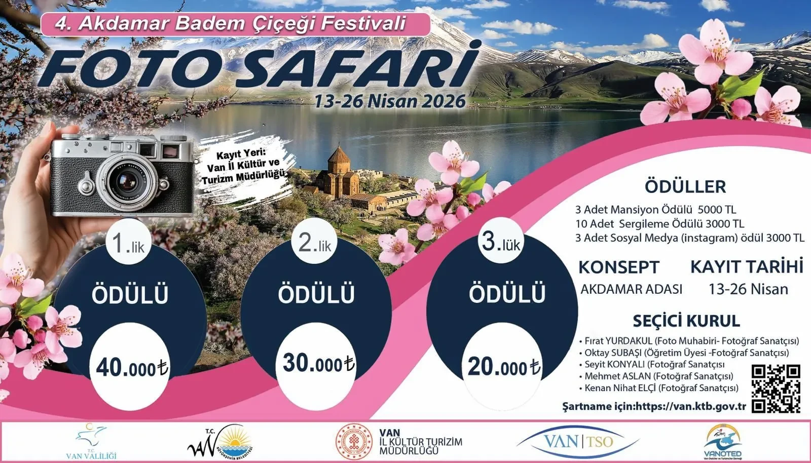 Akdamar Adası Badem Çiçeği Festivali kapsamında düzenlenen ödüllü foto safari yarışmasının takvimi 13–26 Nisan 2026 olarak güncellenirken “Foto Safari” kayıtları da başladı. Van Valiliği, Van Büyükşehir Belediyesi, Van İl Kültür ve Turizm Müdürlüğü, Van Ticaret ve Sanayi Odası (Van TSO) ve VANOTED paydaşlığında düzenlenen 4. Badem Çiçeği Festivali hazırlıkları sürüyor. Festival kapsamında bu yıl foto safari etkinliği de yer alıyor.
