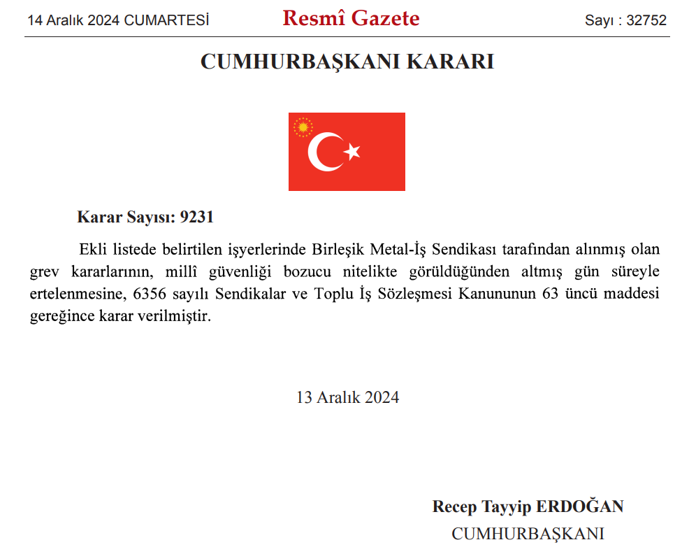 Cumhurbaşkanı Erdoğan imzasıyla Resmi Gazete'de yayımlanan kararda, "Ekli listede belirtilen işyerlerinde Birleşik Metal-İş Sendikası tarafından alınmış olan grev kararlarının, milli güvenliği bozucu nitelikte görüldüğünden altmış gün süreyle ertelenmesine, 6356 sayılı Sendikalar ve Toplu İş Sözleşmesi Kanununun 63 üncü maddesi gereğince karar verilmiştir" denildi.