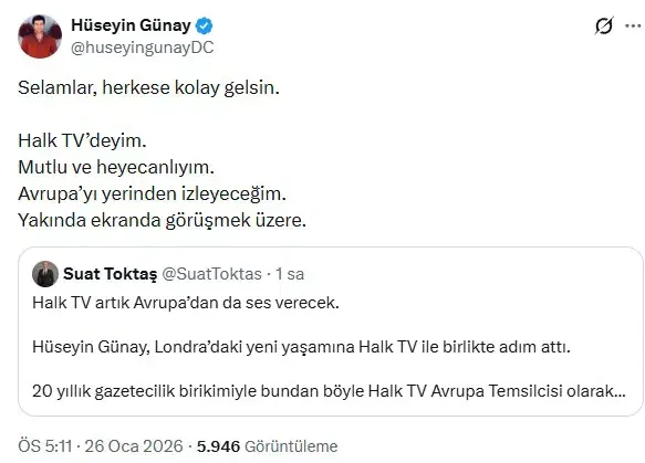 "Selamlar, herkese kolay gelsin. Halk TV’deyim. Mutlu ve heyecanlıyım. Avrupa’yı yerinden izleyeceğim. Yakında ekranda görüşmek üzere."