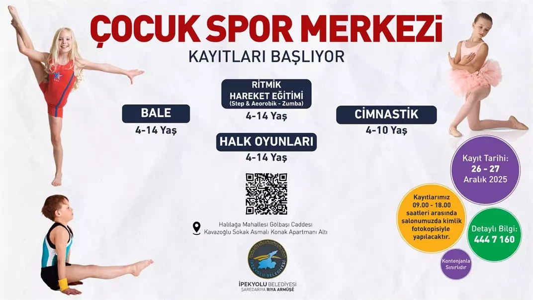 Gençlik ve Spor Müdürlüğümüze bağlı Çocuk Spor Merkezi’nde yeni dönem kayıtları başlıyor. Ritmik Hareket Eğitimi, Bale, Halk Oyunları ve Cimnastik branşlarında başlayacak eğitimlerle çocuklarımızın fiziksel ve zihinsel gelişimlerine katkı sunulması hedefleniyor.