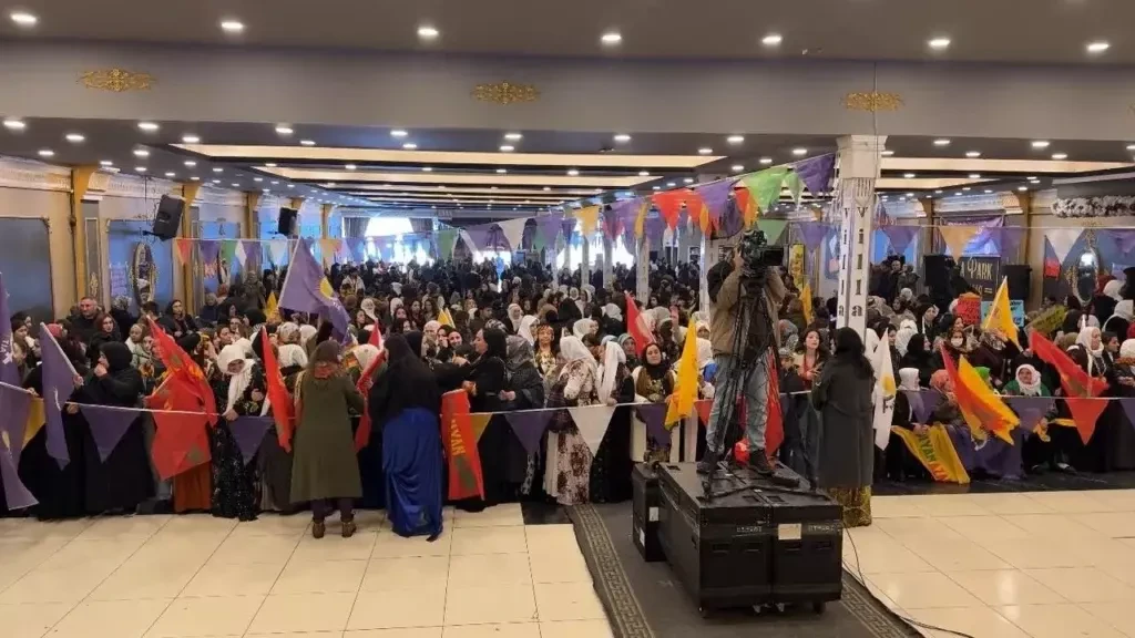 Van’da olumsuz hava koşulları nedeniyle bir düğün salonunda düzenlenen 8 Mart Kadınlar Günü etkinliği renkli görüntülere sahne oldu. Salonu hınca hınç dolduran kadınlar, sürece yönelik mesajlarını ilettiler.
