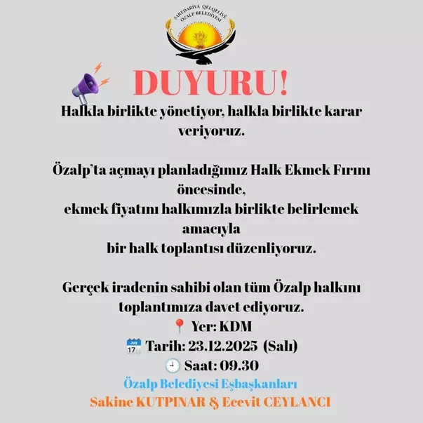 “Özalp’ta açmayı planladığımız Halk Ekmek Fırını öncesinde, ekmek fiyatını halkımızla birlikte belirlemek amacıyla bir halk toplantısı düzenliyoruz. Gerçek iradenin sahibi olan tüm Özalp Halkını toplantımıza davet ediyoruz.”