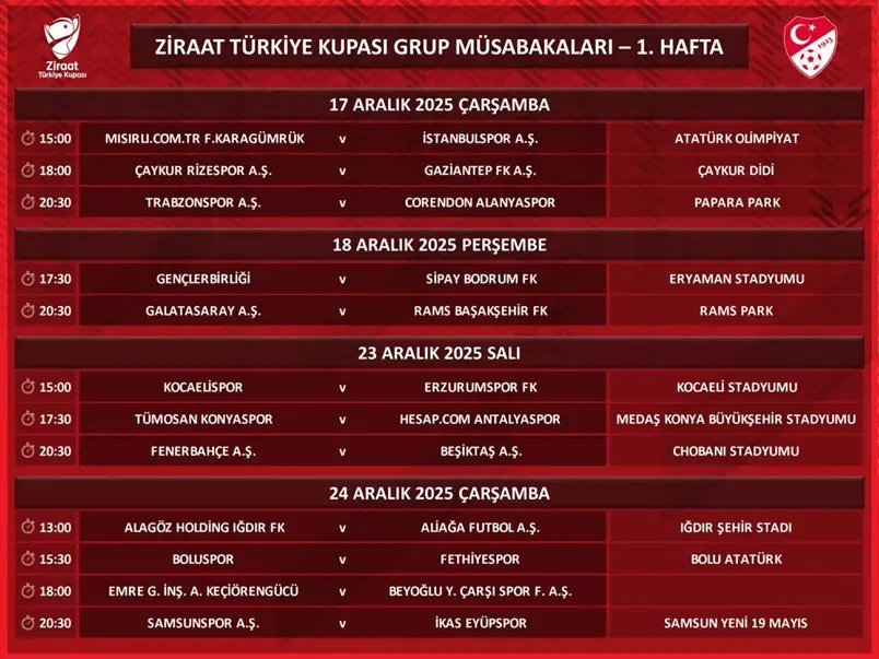 Türkiye Futbol Federasyonu (TFF) Türkiye Kupası grup maçları 1. hafta programını açıkladı.