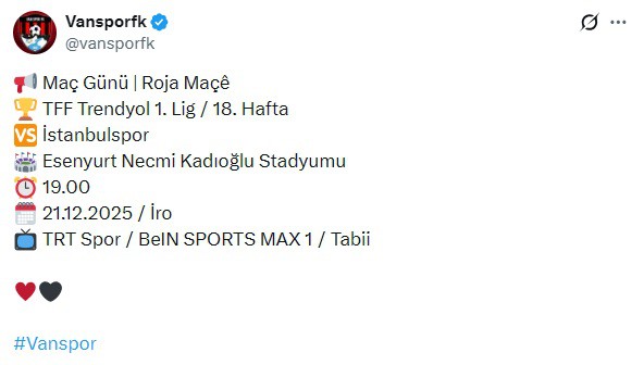 Ligin ilk devresine son iki maç kalırken Vanspor, 21 Aralık Pazar günü Esenyurt Necmi Kadıoğlu Stadında 19.00 İstanbulspor’a konuk olacak. Her iki takım için büyük önem taşıyan bu maç 3 farklı kanalda canlı olarak yayınlanacak. İstanbulspor - Vanspor maçı TRT Spor, Beinsports Max 1 ve TRT Tabii kanallarından canlı olarak futbolseverlerle buluşacak.