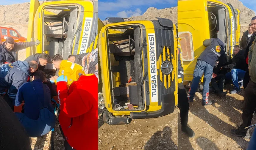 Edinilen bilgilere göre kaza, sabah saatlerinde Tuşba Belediyesi garajı çıkışında meydana geldi. Sürücüsünün ismi henüz öğrenilemeyen 65 AH 406 plakalı, içi mıcır dolu iş kamyonu devrildi.