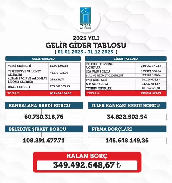 Tuşba Belediyesi yetkilileri, paylaşılan gelir-gider tablosunun şeffaflık, hesap verebilirlik, halkçı belediyecilik ve katılımcı yönetim anlayışıyla düzenli olarak halkla paylaşılmaya devam edeceğini vurguladı.