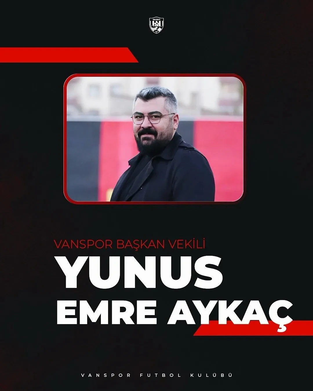 Yapılan açıklamada şu ifadelere yer verildi: “Şehrivan Gazetesi İmtiyaz Sahibi ve Yönetim Kurulu Başkan Vekilimiz Yunus Emre Aykaç; Vanspor Futbol Kulübü Başkan Vekilliği görevine getirilmiştir. VGC Ailesi olarak Yunus Emre Aykaç’a yeni görevinde başarılar dileriz.”