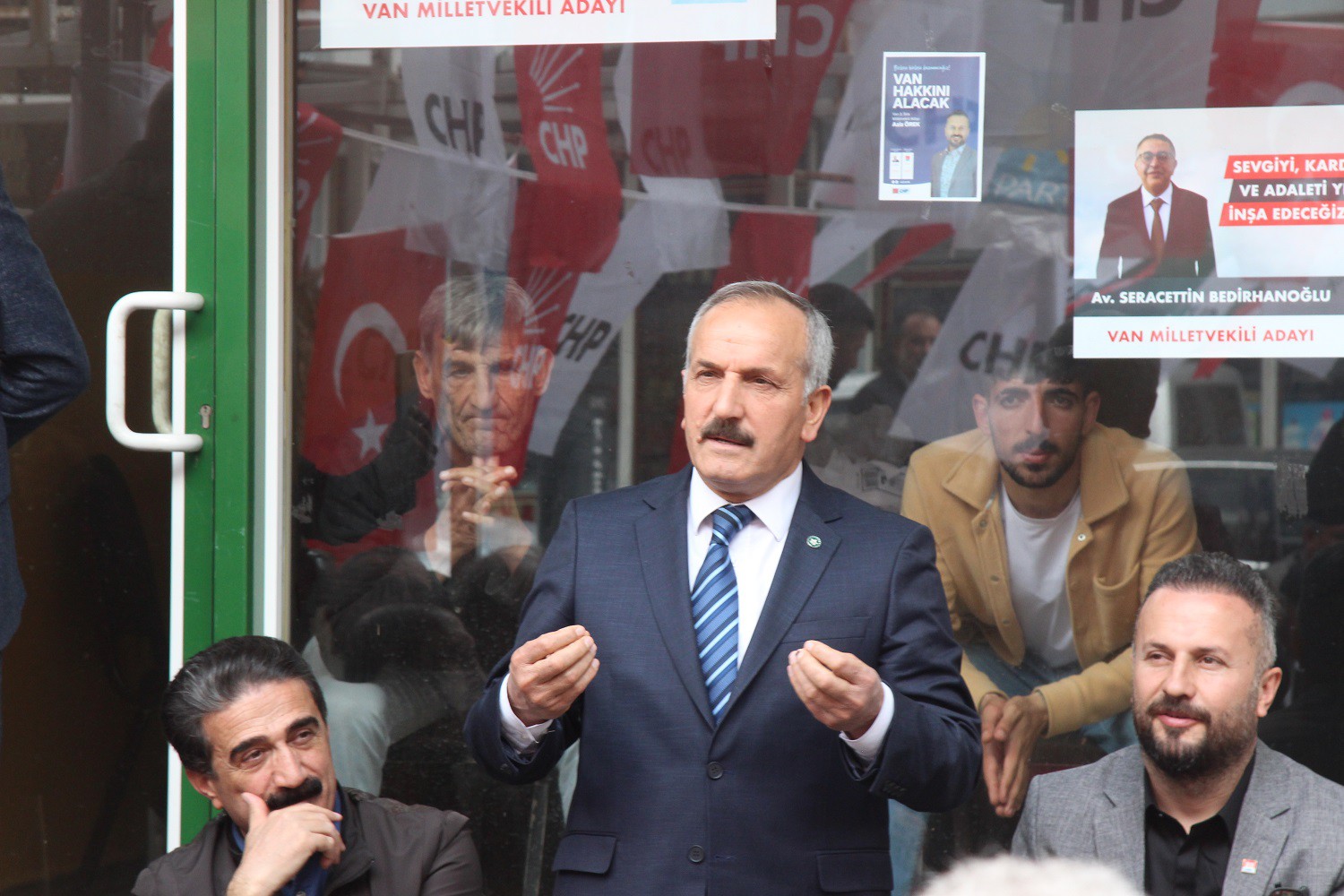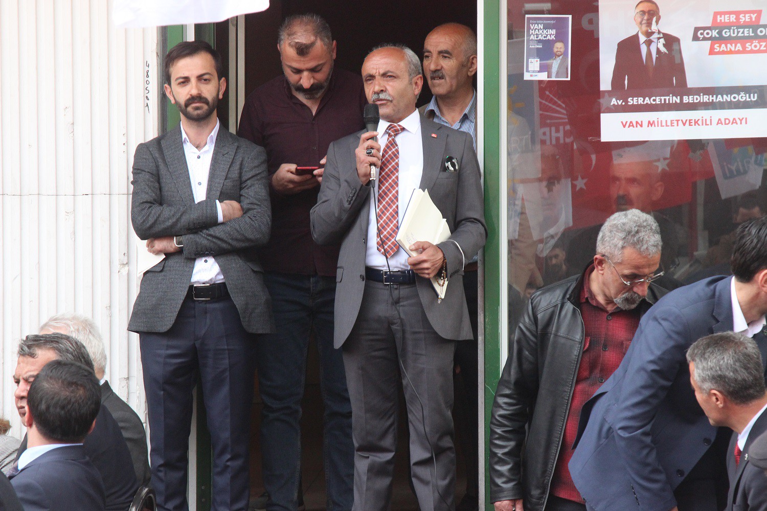 Açılışta konuşan CHP Van Milletvekili adayı Seracettin Bedirhanoğlu, “Bizim sorunumuz haktır, hukuktur, adalettir. Şunun sözünü verebiliriz. Adaletteki paranın paylaşımıyla ilgili söz verebiliriz. Biz gece gündüz bu konuda çalışacağız. Çatak’ın doğal yapısının bozulmaması gerekiyor. Çatak’ta taş evler var. Bu evleri butik otellere çevirebiliriz. Şırnak karayolu bittiği zaman Irak bölgesine kadar turizm merkezi yapabiliriz. Biz bu gerçekliklerle hareket etmek zorundayız. Burada fıstığı geliştirebiliriz. Bakın bıttım dediğimiz ağaçların merkezidir burası. Siirt bu anlamda çok ciddi rakamlara varacak değerde üretim ve ihracat yapıyor. İlimiz, ilçemiz ikili bir yapının arasına sıkışmış biz yeni bir üçüncü yolu yaratmak zorundayız. Bu da ancak sizlerin desteğiyle olur” dedi.