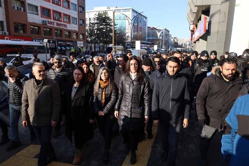 Van merkezde de kayyım protestoları vardı. İki noktada bir araya gelen çok sayıda kişi Kent Meydanı’na kadar yürüyüş düzenledi. Aralarında DEM Parti ve DBP yöneticileri, milletvekilleri ve sivil toplum örgütü temsilcisinin bulunduğu yürüyüşe katılan Eşbaşkan Neslihan Şedal, burada bir konuşma yaptı.
