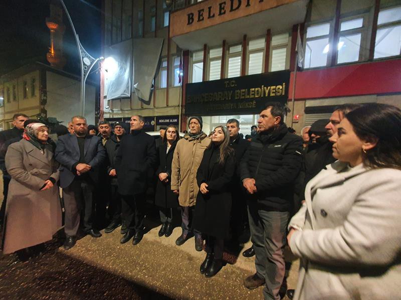 Dün Bahçesaray ilçesine giden Eşbaşkan Neslihan Şedal, akşam saatlerinde kayyım haberinin alınması ardından beraberindeki DEM Parti İl Eşbaşkanı Veysi Dilekçi, DBP İl Eşbaşkanı Cemal Demir, DBP ve DEM Parti ilçe Eşbaşkanları, Van Milletvekili Sinan Çiftyürek, Bahçesaray Belediye Eşbaşkanları Nebahat Benek ve Ayvaz Hazır ile birlikte Bahçesaray Belediyesi’nin önüne geçti. Polis tarafından kuşatılan belediye binasında uzun süre kayyım atanmasına tepki gösteren Eşbaşkanlar, gece boyunca burada tepkilerini sürdürdü.