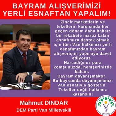 Yaklaşan Kurban Bayramı öncesi alışveriş telaşı başlarken, DEM Parti Van Milletvekili Mahmut Dindar, Van halkına yerel esnafa destek çağrısında bulundu.