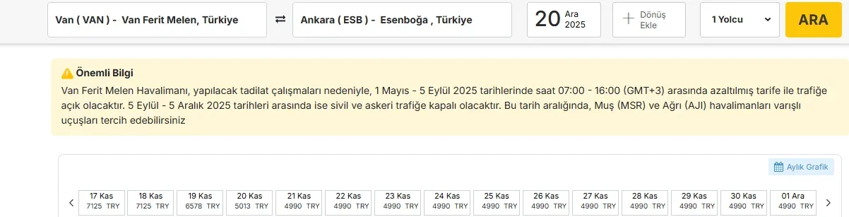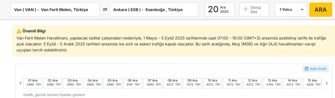 Van–İstanbul hattında aralık ayı boyunca ortalama 3 bin TL seviyesinde olan uçuşlar, vatandaşlar tarafından “ulaşılabilir değil” yorumlarına neden oluyor. En büyük şikâyet ise Van–Ankara seferlerinde. Bu hatta bilet fiyatları 4 bin 500 ile 5 bin TL aralığında seyrederek birçok kişinin bütçesini zorluyor.