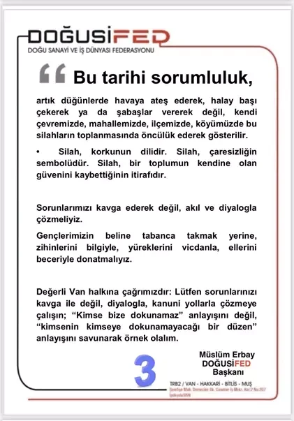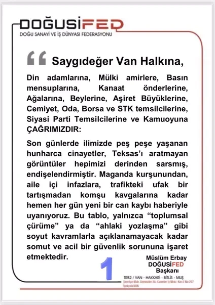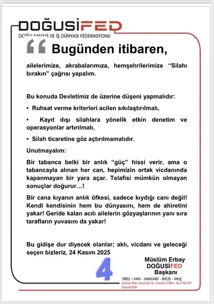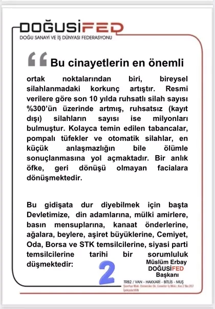 Van Doğu Sanayi ve İş Dünyası Federasyonu (DOĞUSİFED) Yönetim Kurulu Başkanı Müslüm Erbay, ilde son dönemde artan silahlı kavga ve cinayet vakalarına dikkati çekerek, vatandaşlara, kanaat önderlerine ve yetkililere çağrıda bulundu. Erbay, toplumsal huzurun korunması ve silahlanmanın önlenmesi için acil önlemler alınması gerektiğini vurguladı.
