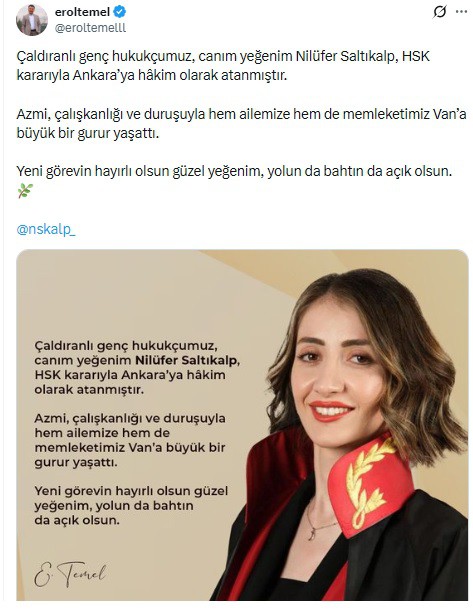 Temel, "Çaldıranlı genç hukukçumuz, canım yeğenim Nilüfer Saltıkalp, HSK kararıyla Ankara’ya hâkim olarak atanmıştır. Azmi, çalışkanlığı ve duruşuyla hem ailemize hem de memleketimiz Van’a büyük bir gurur yaşattı. Yeni görevin hayırlı olsun güzel yeğenim, yolun da bahtın da açık olsun." dedi.