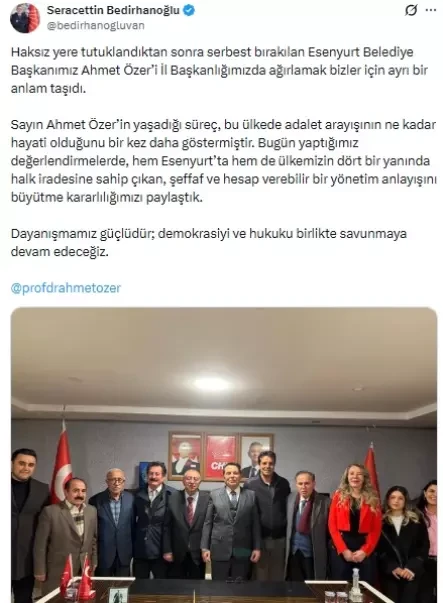 Özer, ardından CHP Van İl Başkanlığını ziyaret etti. CHP Van İl Başkanı Seracettin Bedirhanoğlu, ziyaretten duyduğu memnuniyeti dile getirerek, "Haksız yere tutuklandıktan sonra serbest bırakılan Esenyurt Belediye Başkanımız Ahmet Özer’i İl Başkanlığımızda ağırlamak bizler için ayrı bir anlam taşıdı. Sayın Ahmet Özer’in yaşadığı süreç, bu ülkede adalet arayışının ne kadar hayati olduğunu bir kez daha göstermiştir. Bugün yaptığımız değerlendirmelerde, hem Esenyurt’ta hem de ülkemizin dört bir yanında halk iradesine sahip çıkan, şeffaf ve hesap verebilir bir yönetim anlayışını büyütme kararlılığımızı paylaştık. Dayanışmamız güçlüdür; demokrasiyi ve hukuku birlikte savunmaya devam edeceğiz." dedi.