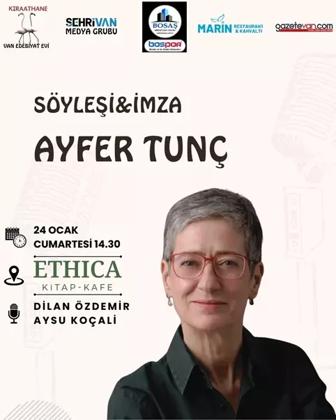 Ayfer Tunç, etkinlikte edebiyat, yazarlık serüveni ve kitapları üzerine okurlarıyla söyleşi yapacak, ardından imza dağıtacak. Organizasyon yetkilileri, etkinliğin ve dağıtılacak kitapların ücretsiz olduğunu belirterek tüm Van halkını etkinliğe davet etti.