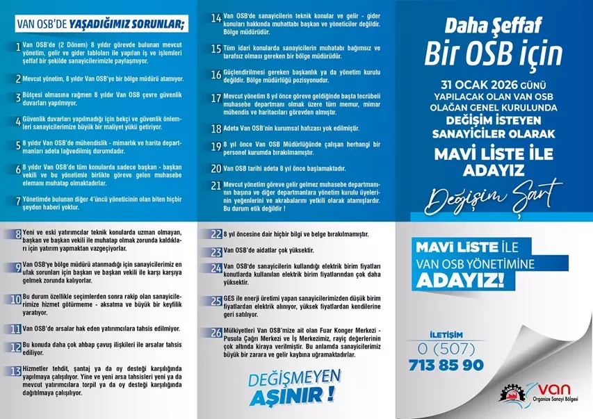 Mavi Liste adına Sanayici - Genel Sekreter ve Çevre Mühendisi Hüseyin Kalay imzasıyla yapılan açıklamada, Van OSB’de katılımcı, şeffaf ve tarafsız bir yönetim anlayışıyla değişimin hedeflendiği belirtilerek, temel amaçlarının OSB’ye kurumsal işlerlik kazandırmak olduğu ifade edildi. Açıklamada; hesap verilebilirliğin sağlanması, kurumlarla güçlü iletişim kurulması, sanayicilerin girdi maliyetlerinin düşürülmesi ve ihracat potansiyelinin artırılması öncelikli hedefler arasında yer aldı.