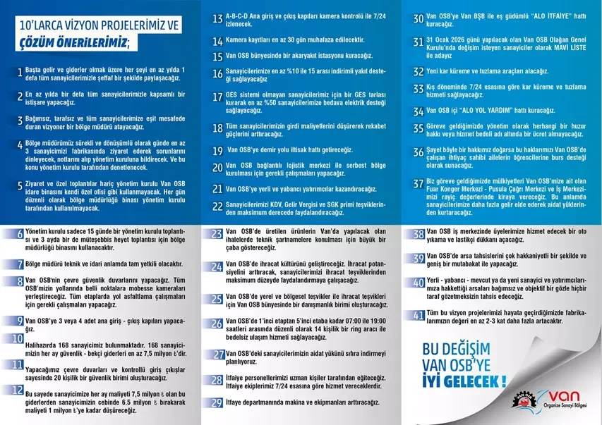 Mavi Liste adına yapılan açıklamada, başkanlık makamının bir denetim ve vizyon kurumu olarak konumlandırılacağı, Van OSB’nin en önemli yürütme organı olan bölge müdürlüğünün ise tüm departmanlarıyla sanayicilerin hizmetine sunulacağı belirtildi.