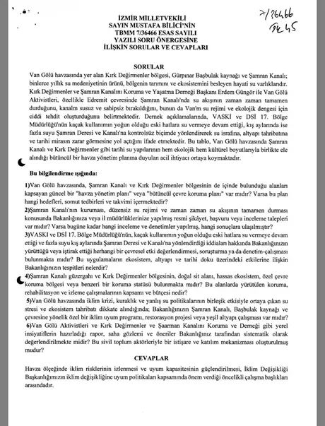 Kırk Değirmenler ve Şamran Kanalı Koruma ve Yaşatma Derneği, Gelecek Partisi İzmir Milletvekili Mustafa Bilici’nin, Van Gölü havzasında yer alan Kırk Değirmenler, Başbulak kaynağı ve Şamran Kanalı ile ilgili Çevre, Şehircilik ve İklim Değişikliği Bakanlığı’na yönelttiği soru önergesi ve verilen yanıtları değerlendirdi.