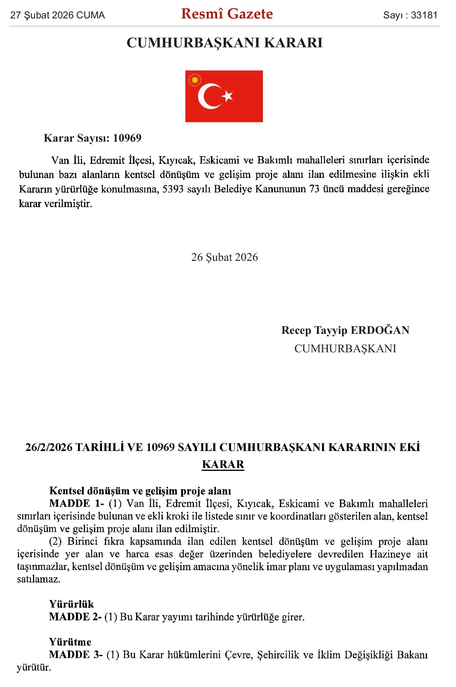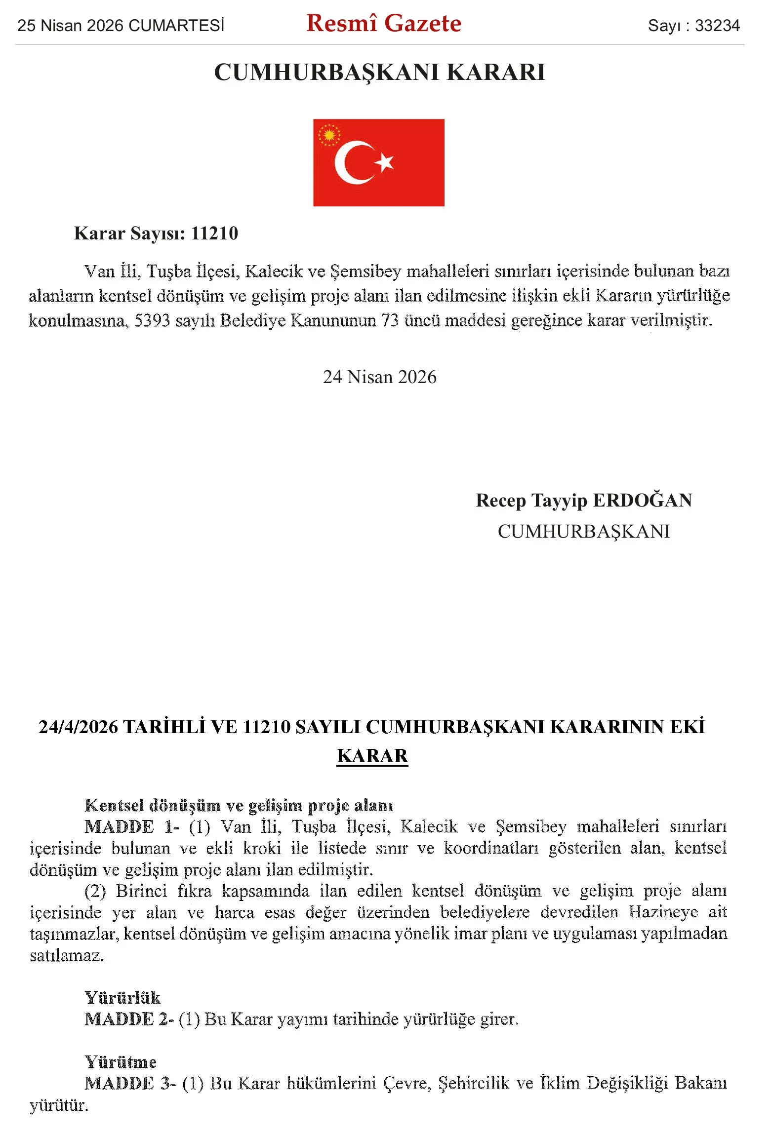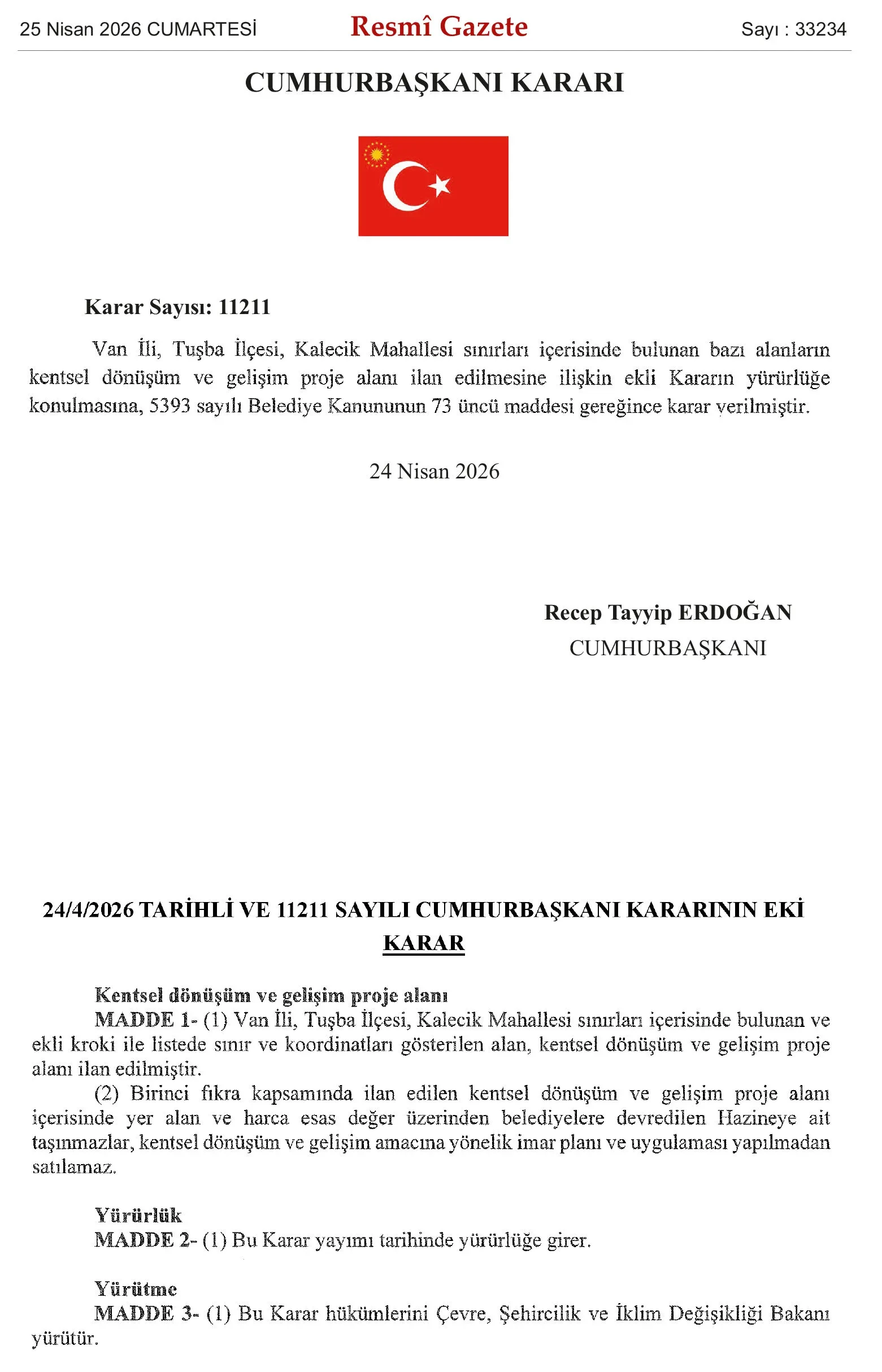 Cumhurbaşkanı Recep Tayyip Erdoğan’ın imzasıyla Resmi Gazete’de yayımlanan karara göre, Van’da kentsel dönüşüm kapsamında yeni bir adım atıldı.