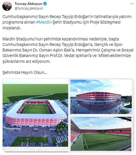 Mardin Valisi Tuncay Akkoyun, konuyla ilgili X (eski adı Twitter) hesabından paylaşımda bulunarak şu ifadelere yer verdi: "Cumhurbaşkanımız Sayın Recep Tayyip Erdoğan’ın talimatlarıyla yatırım programına alınan #Mardin Şehir Stadyumu için Proje Sözleşmesi imzalandı. Mardin Stadyumu’nun şehrimize kazandırılması nedeniyle, başta Cumhurbaşkanımız Sayın Recep Tayyip Erdoğan’a, Gençlik ve Spor Bakanımız Sayın Dr. Osman Aşkın Bak’a, Hemşehrimiz Çalışma ve Sosyal Güvenlik Bakanımız Sayın Prof.Dr. Vedat Işıkhan’a ve Milletvekillerimize şükranlarımı arz ediyorum. Şehrimize Hayırlı Olsun…"