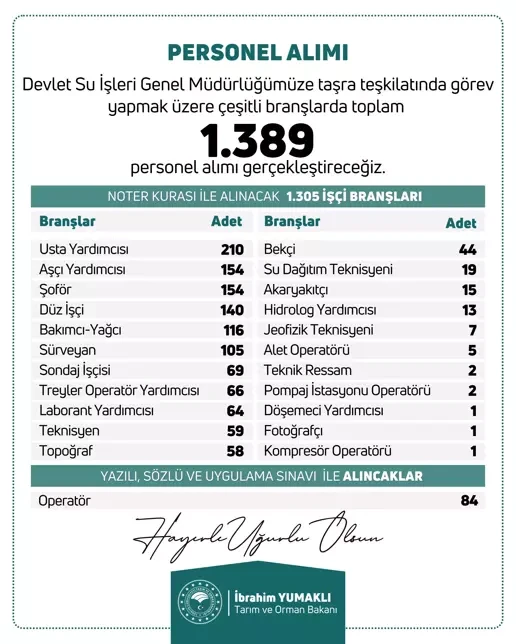 Bakan Yumaklı, sosyal medya hesabından yaptığı paylaşımda, "Devlet Su İşleri Genel Müdürlüğümüzün taşra teşkilatında görev yapmak üzere 1.389 personel alımı gerçekleştireceğiz. Ülkemizin dört bir yanında görev alacak yeni çalışma arkadaşlarımıza şimdiden kolaylıklar diliyorum. Hayırlı uğurlu olsun" dedi.
