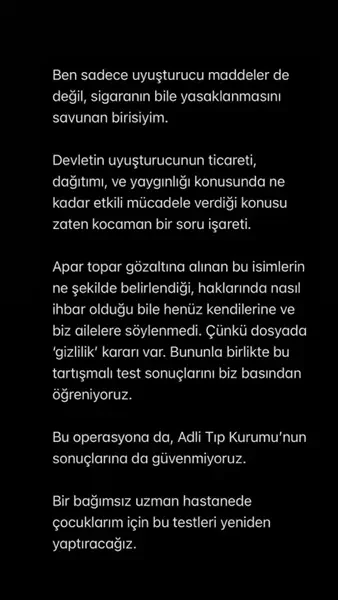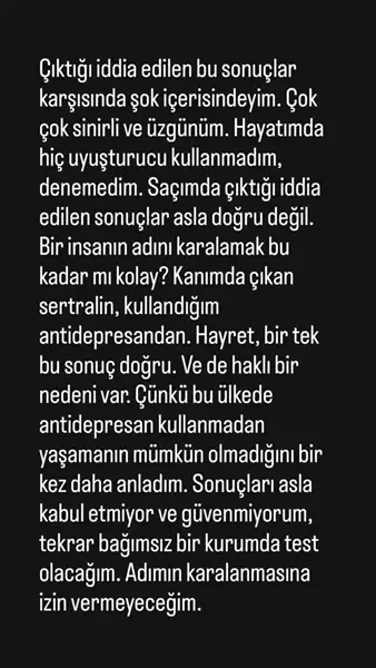 Talu paylaşımında şu ifadeleri kullandı: “Şok içerisindeyim. Hayatımda hiç uyuşturucu kullanmadım. Sonuçlar asla doğru değil. Bir insanın adını karalamak bu kadar kolay mı? Bir tek kanımda çıkan sertralin sonucu doğru, kullandığım antidepresan. Bu ülkede antidepresan kullanmadan yaşamanın mümkün olmadığını bir kez daha anladım. Sonuçları asla kabul etmiyorum. Tekrar bağımsız bir kurumda test olacağım. Adımın karalanmasına izin vermeyeceğim.”