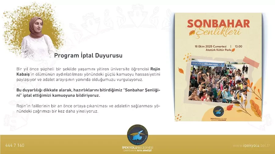 "Bir yıl önce şüpheli bir şekilde yaşamını yitiren üniversite öğrencisi Rojin Kabaiş’in ölümünün aydınlatılması yönündeki güçlü kamuoyu hassasiyetini paylaşıyor ve adalet arayışının yanında olduğumuzu vurguluyoruz. Bu duyarlılığı dikkate alarak, hazırlıklarını bitirdiğimiz “Sonbahar Şenliğini” iptal ettiğimizi kamuoyuna bildiriyoruz. Rojin’in faillerinin bir an önce ortaya çıkarılması ve adaletin sağlanması yönündeki çağrımızı bir kez daha yineliyoruz."