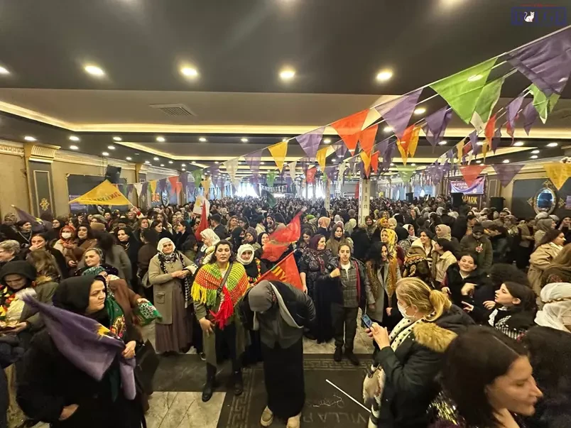 Van’da olumsuz hava koşulları nedeniyle bir düğün salonunda düzenlenen 8 Mart Kadınlar Günü etkinliği renkli görüntülere sahne oldu. Salonu hınca hınç dolduran kadınlar, sürece yönelik mesajlarını ilettiler.