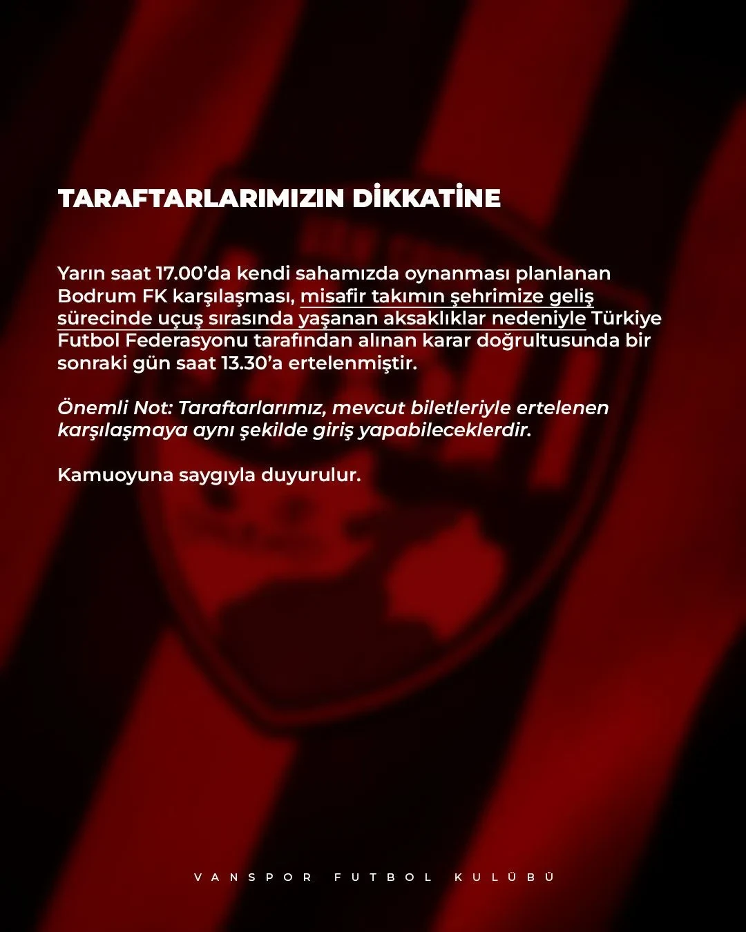 Vanspor, kulübü bir açıklama yaparak maçın ertelendiğini duyurdu