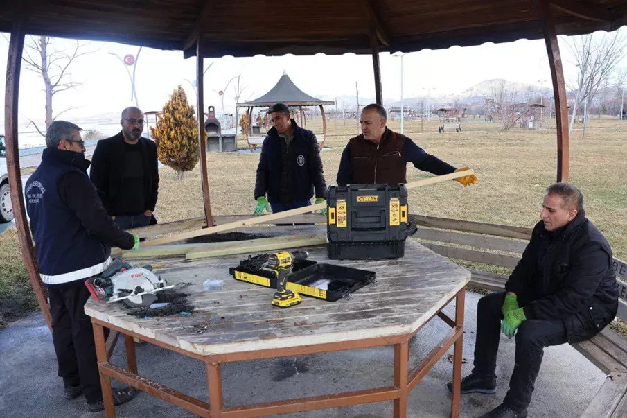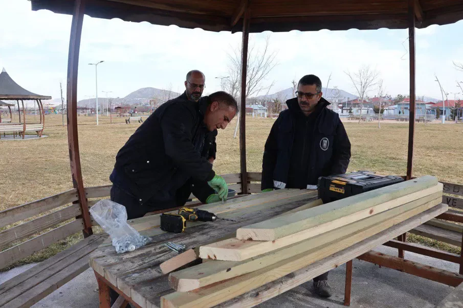 Park ve Bahçeler Müdürlüğü, 15 Temmuz Parkı'nda yürütülen elektrik bakım çalışmalarının tamamlanmasının ardından yakılarak tahrip edilen masaları tamir ederek kamelya şıngıllarını yeniledi.