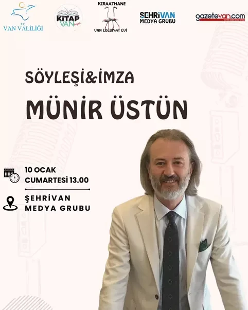 İstanbul Ticaret Odası Yönetim Kurulu Üyesi, İstanbul Ticaret Odası Meclis Üyesi, YAYFED YK Başkanı, Profil Kitap yayın evi kurucusu Münir Üstün Van'da okurlarıyla buluşuyor. Etkinlik,10 Ocak Cumartesi günü günü saat 13.00’te Şehrivan Medya Grubunda gerçekleştirilecek. Katılımın ücretsiz olduğu programda, yazarın futbolu konu alan "Arka Direkte Kendini Unutturmak" kitabı da yine ücretsiz olarak okuyucalara dağıtalacak.
