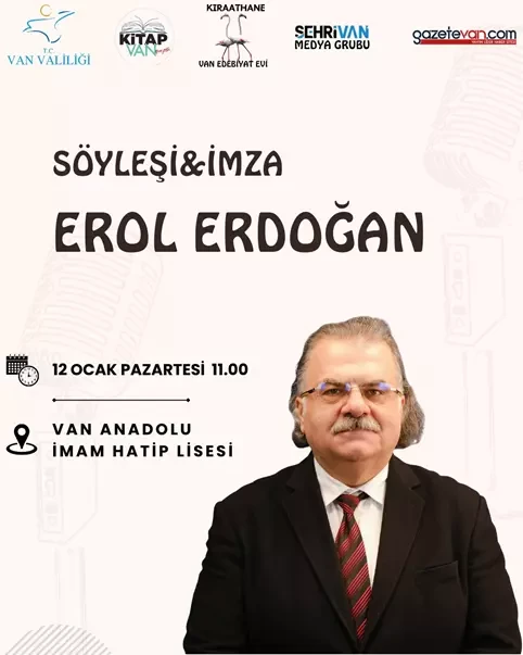 Yazar, MEB Bakan Danışmanı Erol Erdoğan, Van'da okurlarıyla buluşuyor. Etkinlik,12 Ocak Pazartesi günü günü saat 11.00’te Van Anadolu İmam Hatip Lisesinde gerçekleştirilecek. Yazarın kitapları da yine ücretsiz olarak okuyucalara dağıtalacak.
