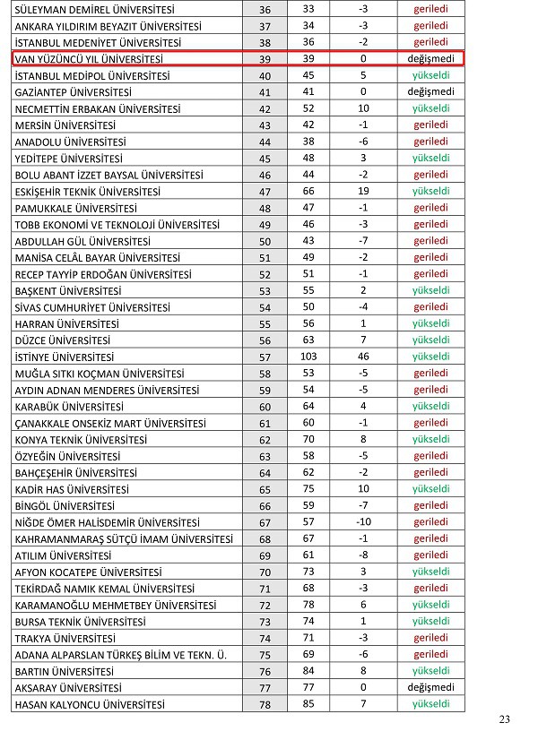 Dünyada üniversite sıralamalarını yapan yetkili kuruluşlardan biri olan ODTÜ URAP, 2024-2025 yılında Türkiye'nin en iyi üniversitelerini sıraladığı raporu internet sitesinden yayınladı. Türkiye’nin ve bölgenin en saygın üniversitelerinden biri olan Van Yüzüncü Yıl Üniversitesi hem Türkiye hem de dünyada adından söz ettirmeye devam ediyor. Türkiye’de tıp fakültesi olan üniversiteler sıralamasında Van YYÜ 30’uncu sırada yer alırken genel sıralamada ise geçtiğimiz yıldaki yerini koruyarak 39’uncu sırada yer aldı. (Şehrivan Gazetesi)