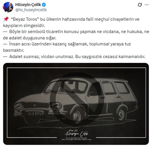 “Beyaz Toros bu ülkenin hafızasında faili meçhul cinayetlerin ve kayıpların simgesidir. Böyle bir sembolü ticaretin konusu yapmak ne vicdana, ne hukuka, ne de adalet duygusuna sığar. İnsan acısı üzerinden kazanç sağlamak, toplumsal yaraya tuz basmaktır. Adalet susmaz, vicdan unutmaz. Bu saygısızlık cezasız kalmamalıdır.”