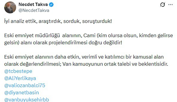 Takva, Cumurbaşkanlığını, İçişleri Bakanı Ali Yerlikaya'yı, Vali Ozan Balcı'yı, Diyanet İşleri Başkanlığını ve Van Büyükşehir Belediyesi'ni etiketleyerek sosyal medya hesabından yaptığı açıklamada şu ifadelere yer verdi: "İyi analiz ettik, araştırdık, sorduk, soruşturduk! Eski emniyet müdürlüğü alanının, Cami (kim olursa olsun, kimden gelirse gelsin) alanı olarak projelendirilmesi doğru değildir! Eski emniyet alanının daha etkin, verimli ve katılımcı bir kamusal alan olarak değerlendirilmesi; Van kamuoyunun ortak talebi ve beklentisidir."
