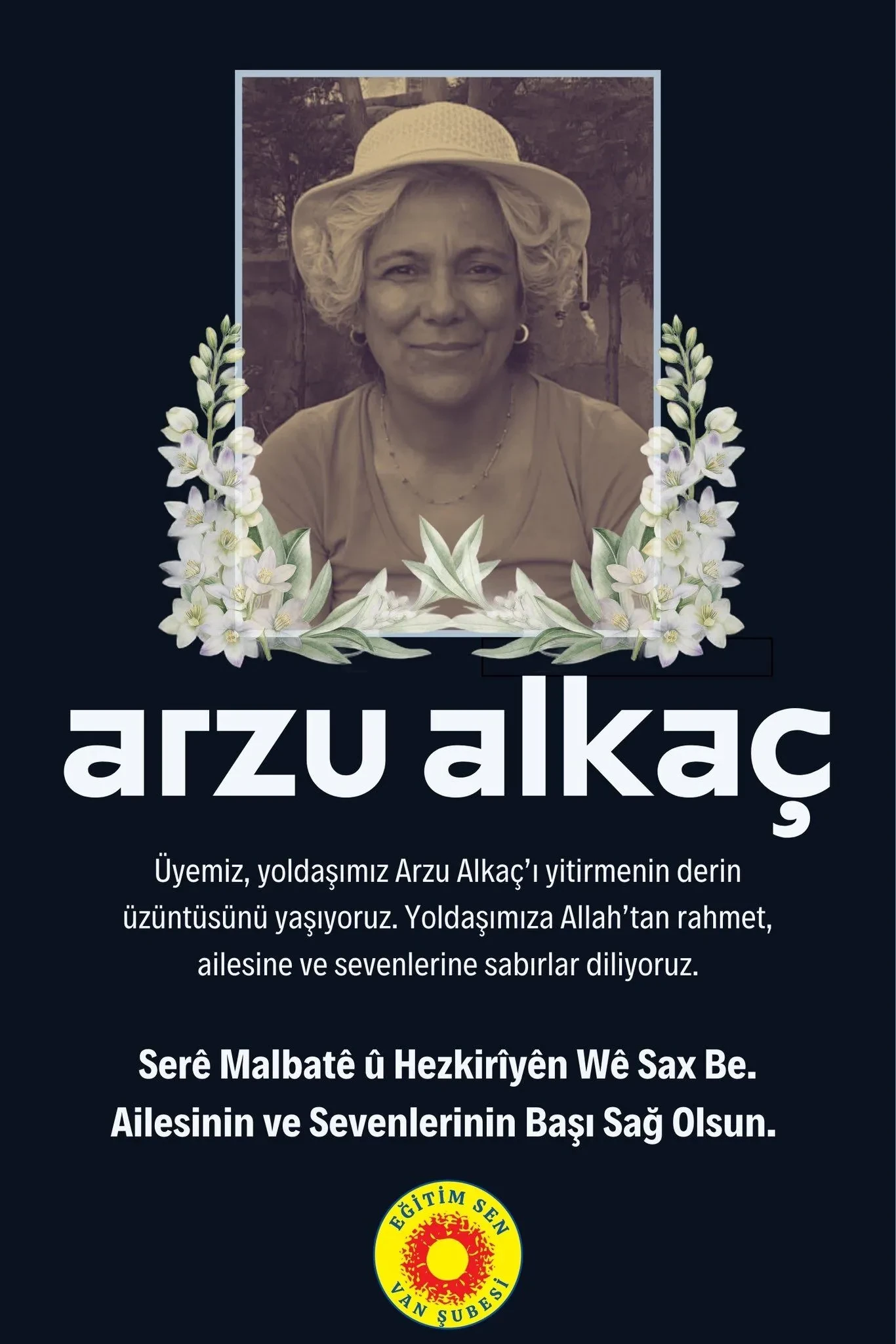 Eğitim-Sen Van İl Başkanlığı da bir taziye mesajı yayımladı. Yapılan taziye mesajında; "Üyemiz, mücadele arkadaşımız, yoldaşımız Arzu Alkaç’ı yitirmenin derin üzüntüsünü yaşıyoruz. Kendisine Allah’tan rahmet, ailesine ve sevenlerine başsağlığı diliyoruz" denildi.