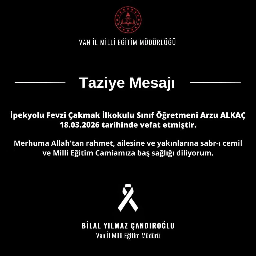 Van’ın İpekyolu ilçesindeki Fevzi Çakmak İlkokulu, güne kara bir haberle başladı. Okulun sevilen ve tecrübeli sınıf öğretmenlerinden Arzu Alkaç, 18 Mart 2026 tarihinde hayatını kaybetti. Meslek hayatı boyunca sadece akademik başarıya değil, öğrencilerinin karakter gelişimine ve değerler eğitimine de büyük önem veren Alkaç’ın vefatı, başta ailesi olmak üzere meslektaşlarını ve tüm öğrencilerini yasa boğdu.