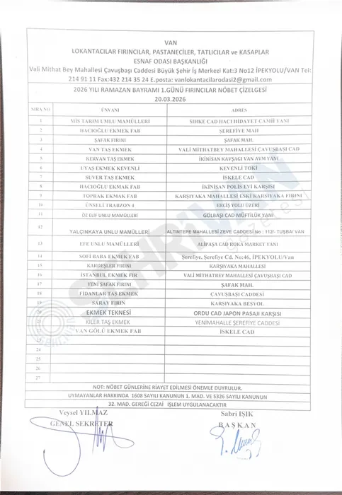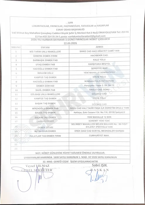 Van Fırıncılar Odası Başkanlığı Van’da bayram süresi boyunca açık olacak fırınların listesini açıkladı.