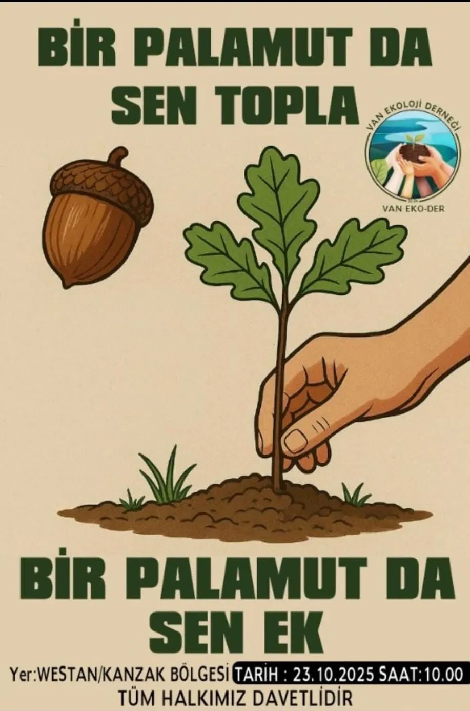 Serhat News'in haberine göre; “Bir Palamut da Sen Ek” sloganıyla düzenlenen fidan dikimi etkinliği, Gevaş’a bağlı Kanzak Bölgesi’nde yapılacak. VAN EKO-DER, etkinliğe katılım çağrısında bulunarak, her bir vatandaşın diktiği fidanın Van’ın geleceği için atılmış yeşil bir adım olacağını belirtti.