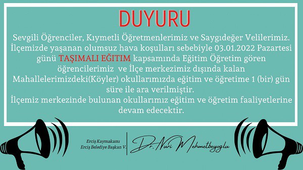Erciş kaymakamlığından yapılan açıklamada "Olumsuz hava şartları nedeniyle 03.01.2022 Pazartesi günü taşımalı eğitim kapsamındaki öğrencilerimiz ve Merkez dışında kalan mahallelerimizde ki (köyler) okullarımız 1 (bir) gün tatil edilmiştir. Ancak İlçemiz Merkezindeki Okullarimiz eğitim öğretim faaliyetlerine devam edecektir." Denildi.
