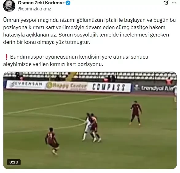 Bandırmaspor maçında verilen kırmızı kart kararına da değinen Korkmaz, pozisyonun detaylarına dikkat çekerek, “Bandırmaspor oyuncusunun kendisini yere atması sonucu aleyhimizde verilen kırmızı kart pozisyonu” ifadeleriyle kararın haksız olduğunu savundu.