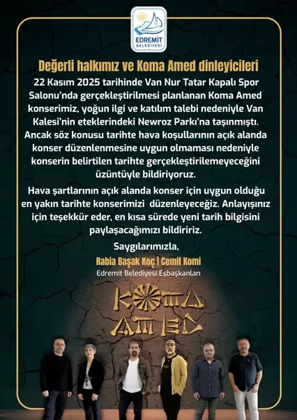 Edremit Belediyesi Eşbaşkanları Rabia Başak Koç ve Cemil Komi tarafından yapılan açıklamada, konserin olumsuz hava koşulları nedeniyle ileri bir tarihe alındığı duyuruldu.