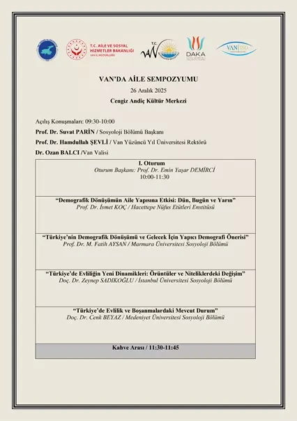 Van Yüzüncü Yıl Üniversitesi Sosyoloji Bölümü öncülüğünde düzenlenen Van’da Aile Sempozyumu, 26 Aralık 2025 tarihinde Van’da yapılacak.